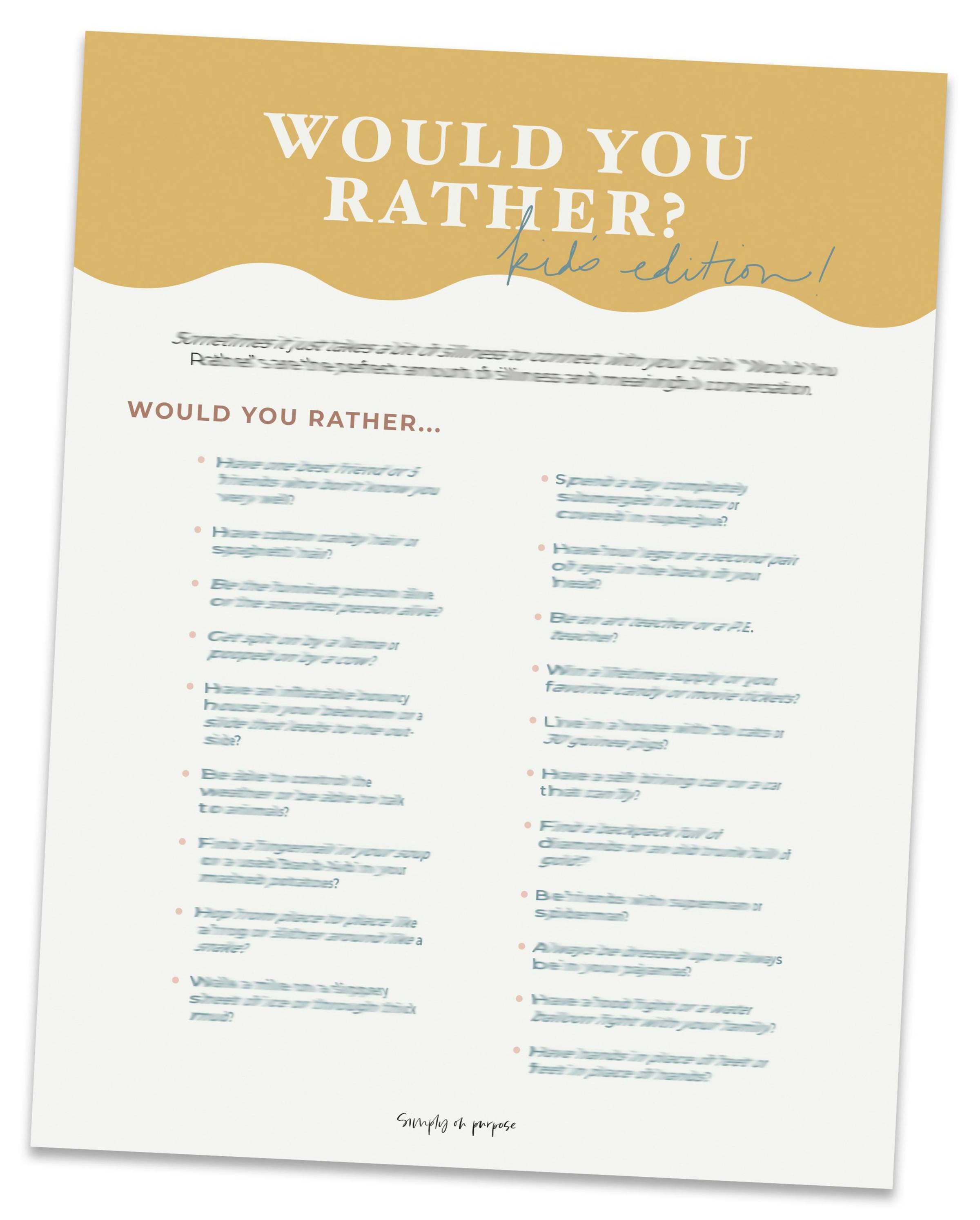 | Hi friend, Sometimes it just takes a bit of silliness to connect with your child. "Would You Rather"s are the perfect amount of silliness and meaningful conversation! They help us get out of our adult logical brains and into play mode. Add the printable to your cart, and the code WOULDYOURATHER will take the total to $0.