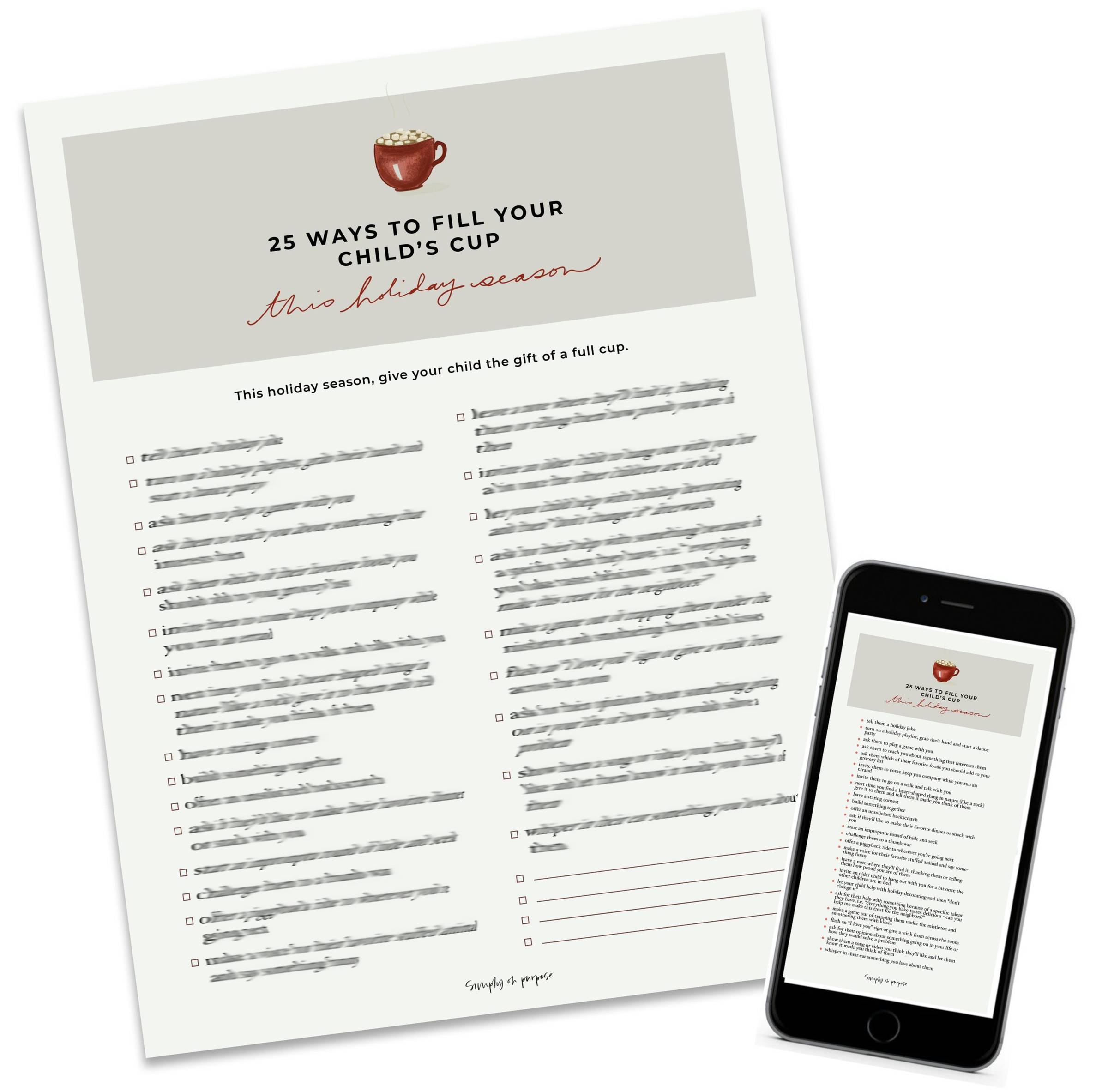 | Hi friend, This holiday season, give your child the gift of a full cup. Imagine with me for a second your child has an internal emotional cup. Life around them contributes to how full their cup is. When it's empty, they struggle (and oftentimes misbehave!) But the wonderful news is that their cups are SO easy to fill. All it takes is a bit of your undivided attention! I've created a free printable for you, "25 Ways to Fill Your Child's Cup This Holiday Season." The code OVERFLOWING is automatically applied at checkout to make the printable free!